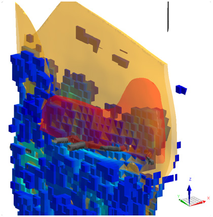 The blue block model is derived from BHP-provided drill data (provided post-survey) The light orange wireframe represents the sulphide shell model. The red shape is the voxel inversion from muon data with no prior constraints. The muon data corresponds quite well to density block model and identifies an additional lobe of the deposit that had not been previously mapped.