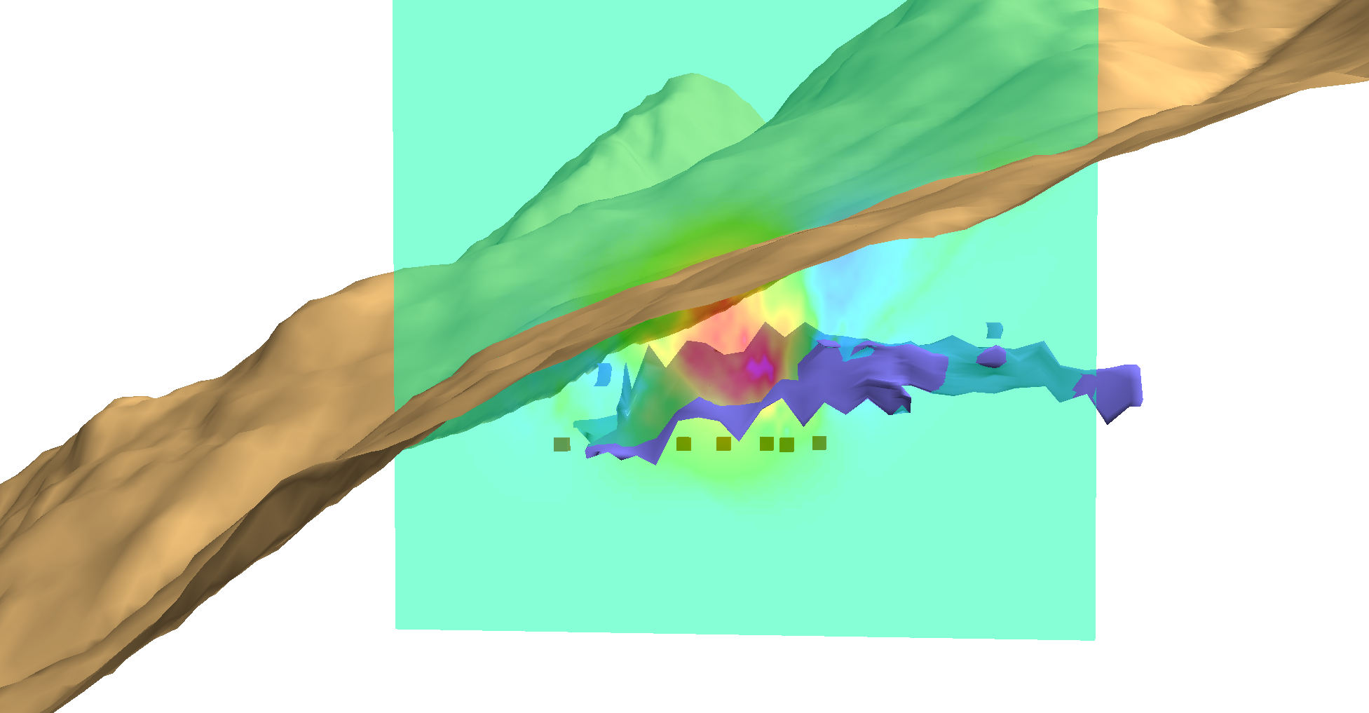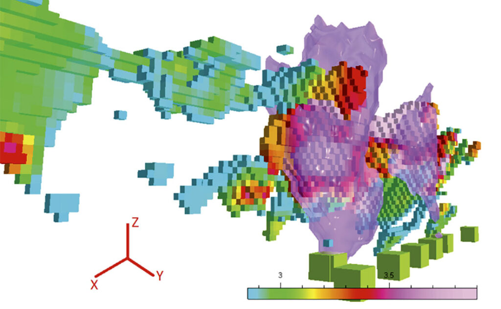 Block model of density from the Price deposit. An iso-surface of the 3D density model (measured in g/cc) from muon data is shown by the pink surface, and the muon detector locations are shown by the green cubes (not to scale).