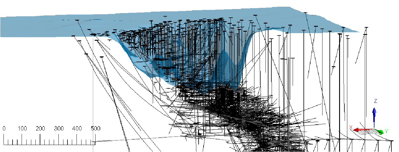 Creighton Mine, showing intensity of drilling activity (500+ drillholes completed over decades of active exploration and mine operations.