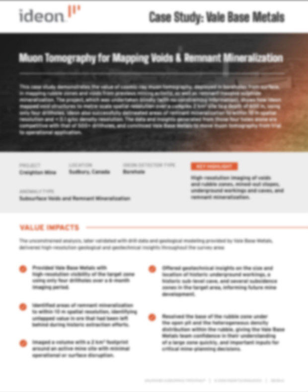 Ideon provided Vale Base Metals with a full-service imaging and intelligence program, including customized deployment design and modelling to ensure optimal outcomes, turnkey equipment bundling and installation logistics, continuous imaging with regular updates to show progressive resolution improvement, remote monitoring and diagnostics, geoscientific analysis and interpretation, and onsite results immersion.